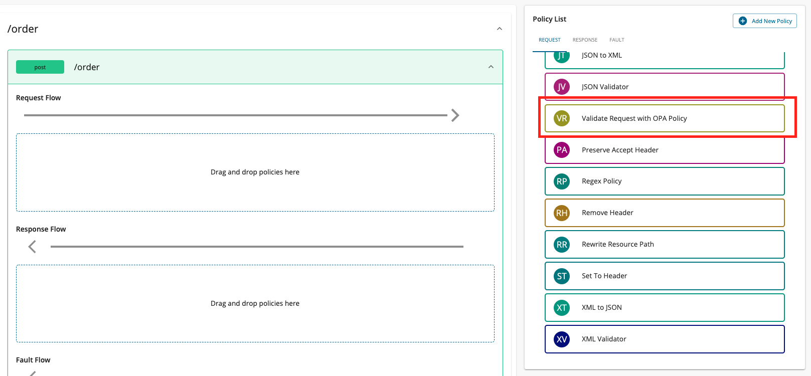 - For this functionality, there is a policy that you can invoke for the request flow named Validate Request with OPA Policy. Drag and drop this policy to the request flow of your required operations.