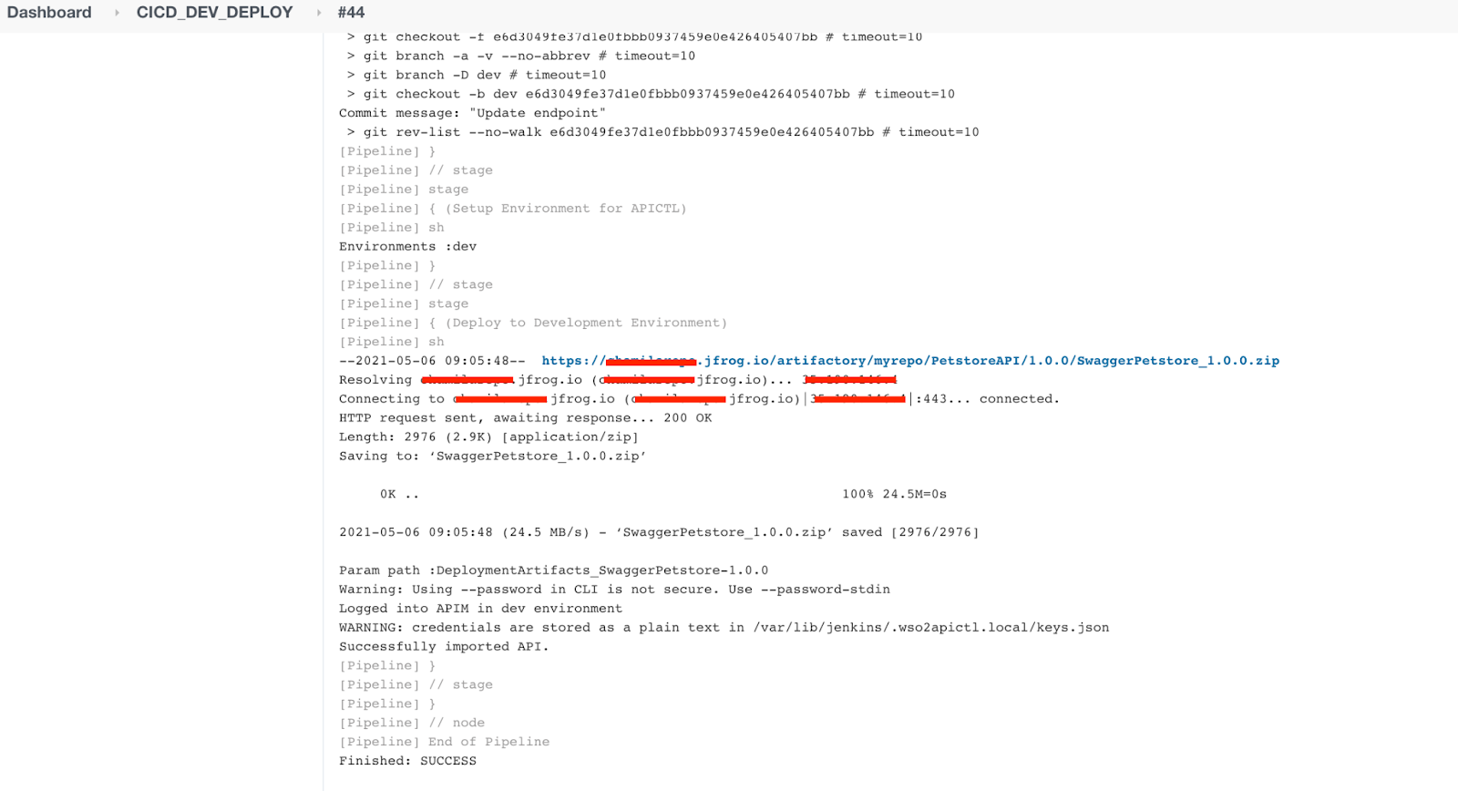 CICD_ARTIFACT_UPLOADwill get triggered first and upload the built component to the Artifactory. This is displayed in the console log of the Jenkins job.Once the bundle is uploaded to the Artifactory repository, it will trigger the deployment Jenkins job. The bundle getting deployed in API-M is displayed in the logs.