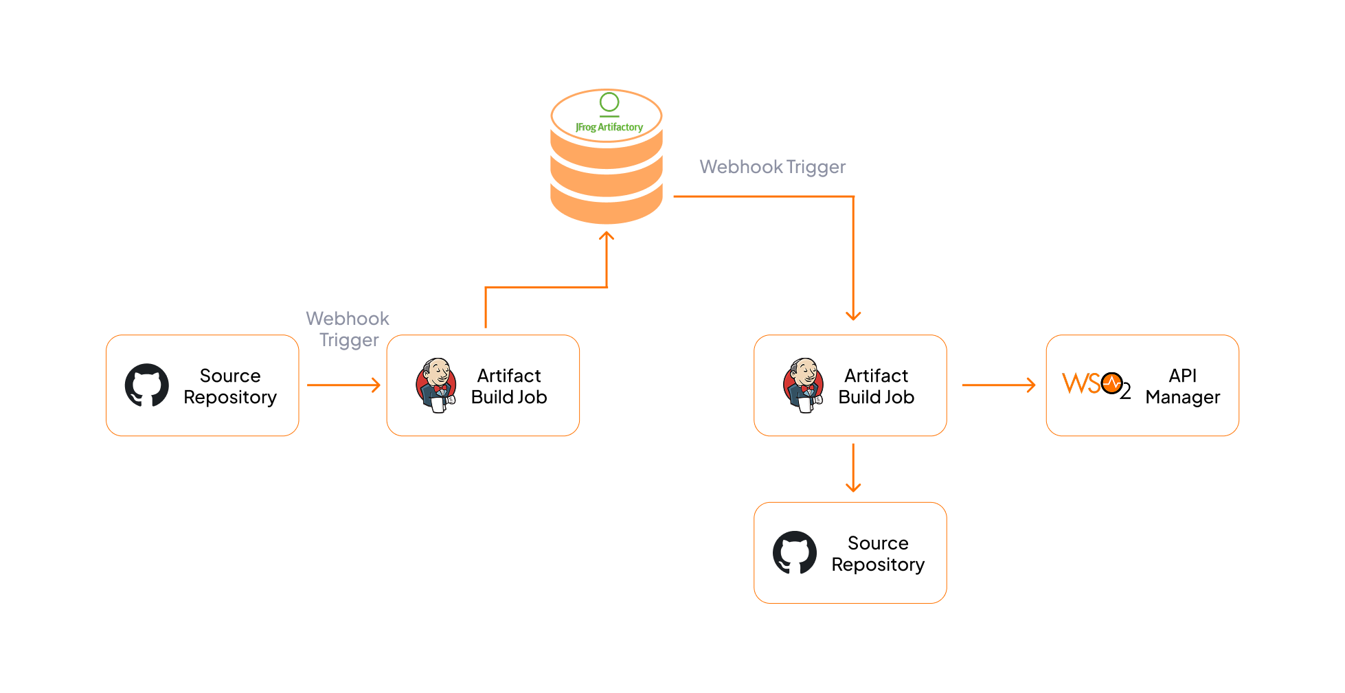 In this section, you will learn how to build an automated process using the WSO2 API Controller (apictl) with WSO2 API Manager (WSO2 API-M). You will see how a solution is built using a version control system (Github), artifact repository(JFrog Artifactory) and CI/CD Tool (Jenkins).
