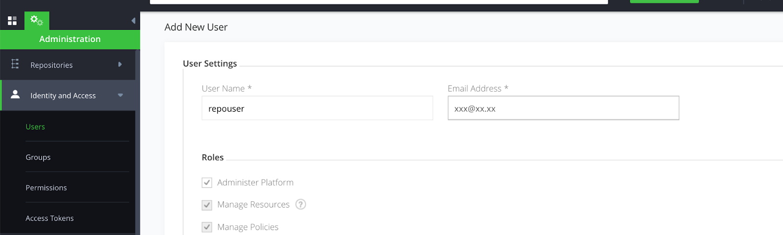 Create a user to upload artifacts. Login using admin credentials and go to Identity and Access → Users and create a user. All roles are selected in this scenario.