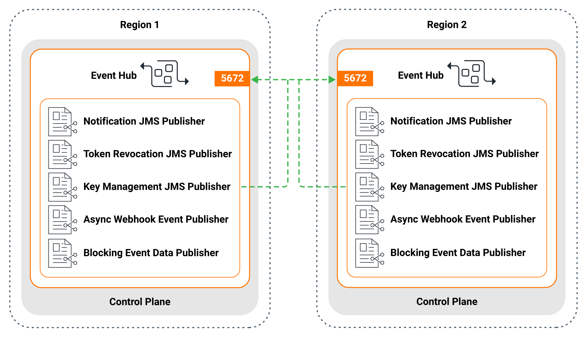 Since the control planes are only connected through the JMS connections, the TCP port 5672 should be exposed to the external parties (Other regions' control planes).
