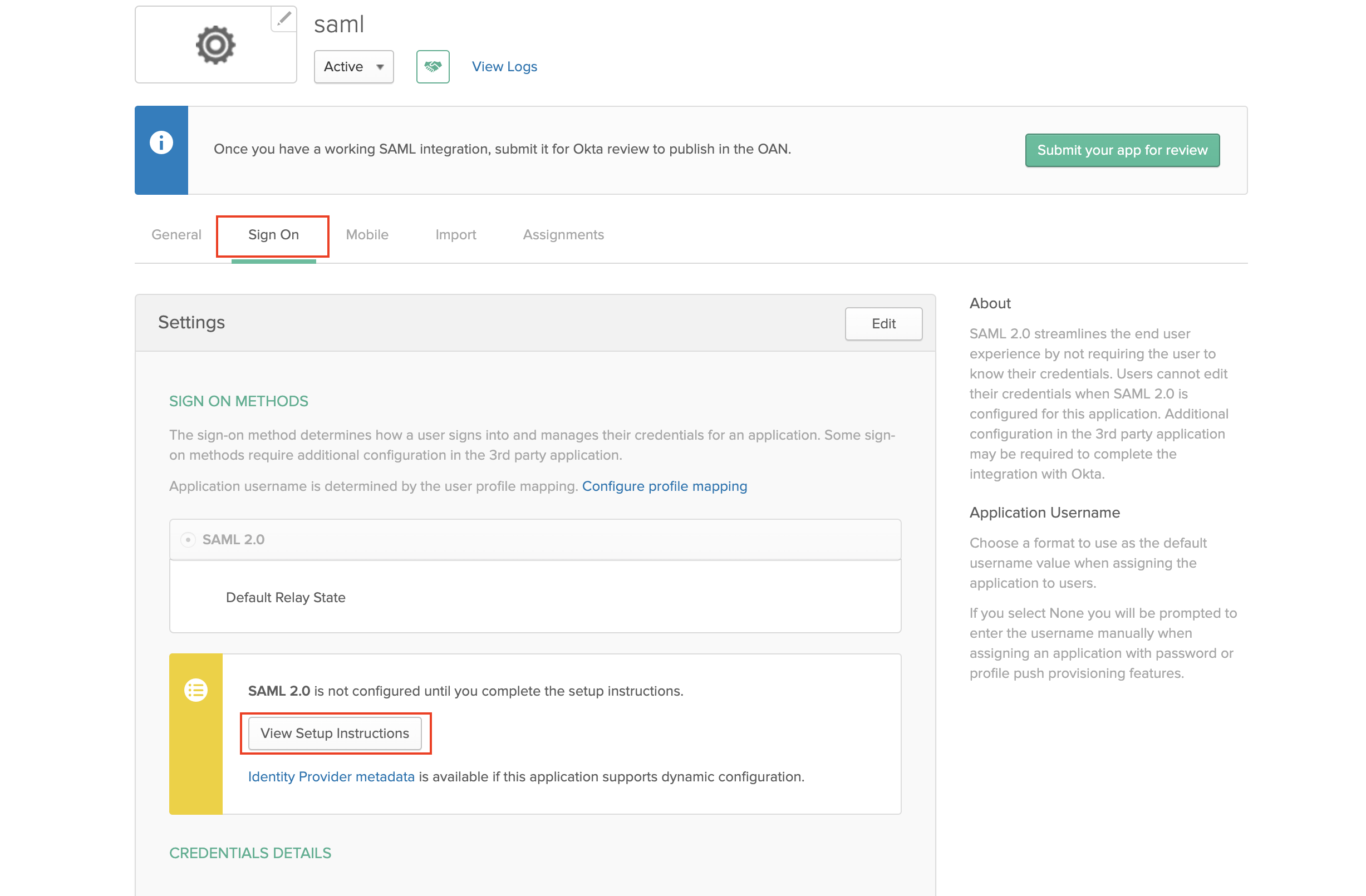 Inside the SAML app you created go to Sign On and click View Setup Instructions.