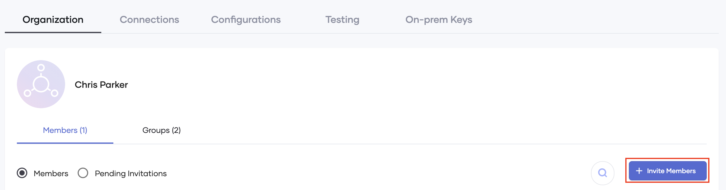The Organization page appears. This page contains information about your organization, such as the organization name, current members, pending members, and different groups within your organization.