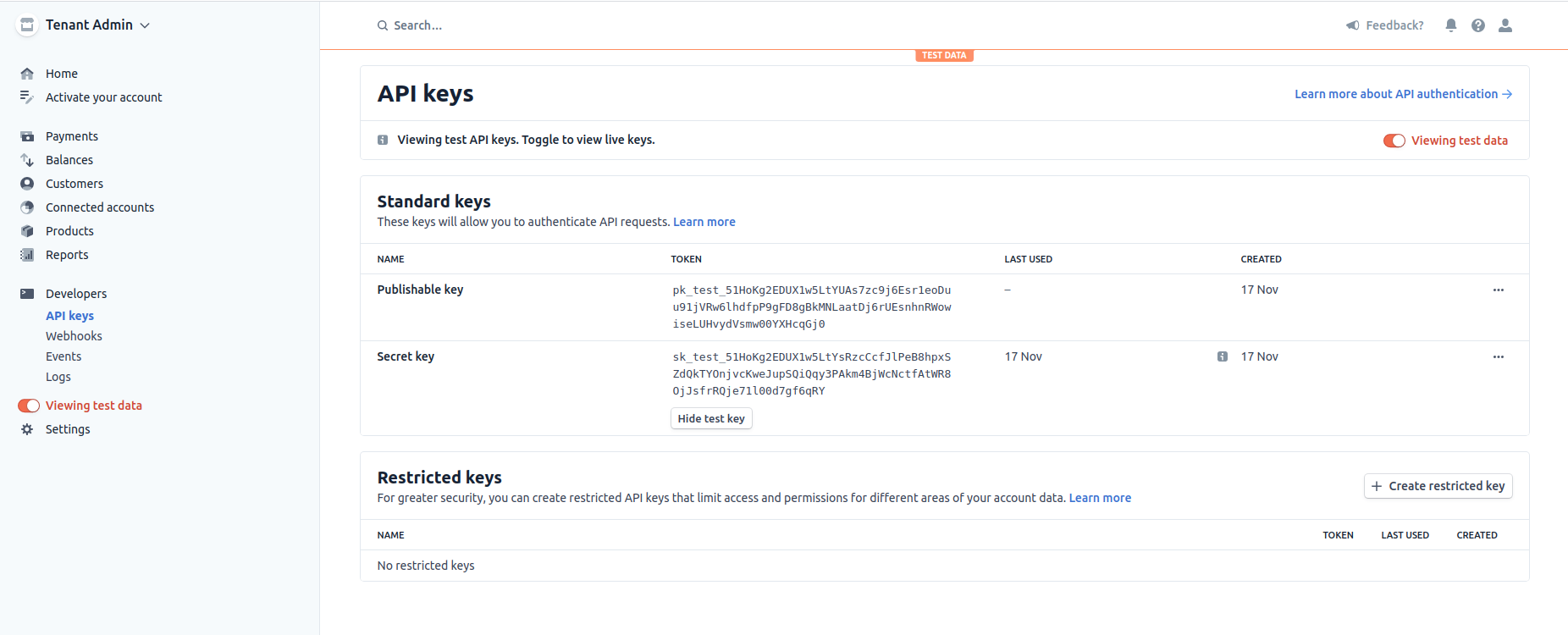 sk_test_wBMSreyjGQoczL9uIw6YPYRq00kcHcQqDi- This is the secret key that corresponds to the Tenant Admin's Stripe account.