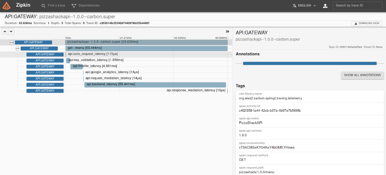 12:54:34,884 [-] [BatchSpanProcessor_WorkerThread-1] TRACE {"Span Id":"e1a28540ebf22850","Tracer Id":"728e26aac8a02d5455dfa0b49fa91950","Operation":"PizzaShackAPI--1.0.0--carbon.super","Latency":"1426ms","Tags":"AttributesMap{data={span.activity.id=b4bb75d4-d4bc-4331-9475-752d0ae2340b, span.request.path=pizzashack/1.0.0/menu, span.api.version=1.0.0, span.api.name=PizzaShackAPI, span.consumerkey=xTShCMSaKY04lhxY4b0lMfLYHewa, span.request.method=GET, span.resource=/menu}, capacity=128, totalAddedValues=7}"}