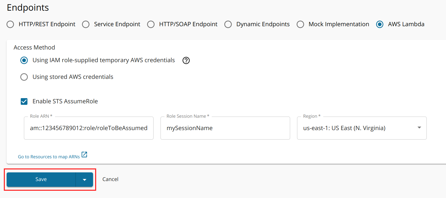 Enable STS AssumeRoleand enter required values to configure STS AssumeRole.Field Value Role ARN ARN of the role to be assumed Role Session Name String value to uniquely identify the session Region  Region of AWS Lambda functions -