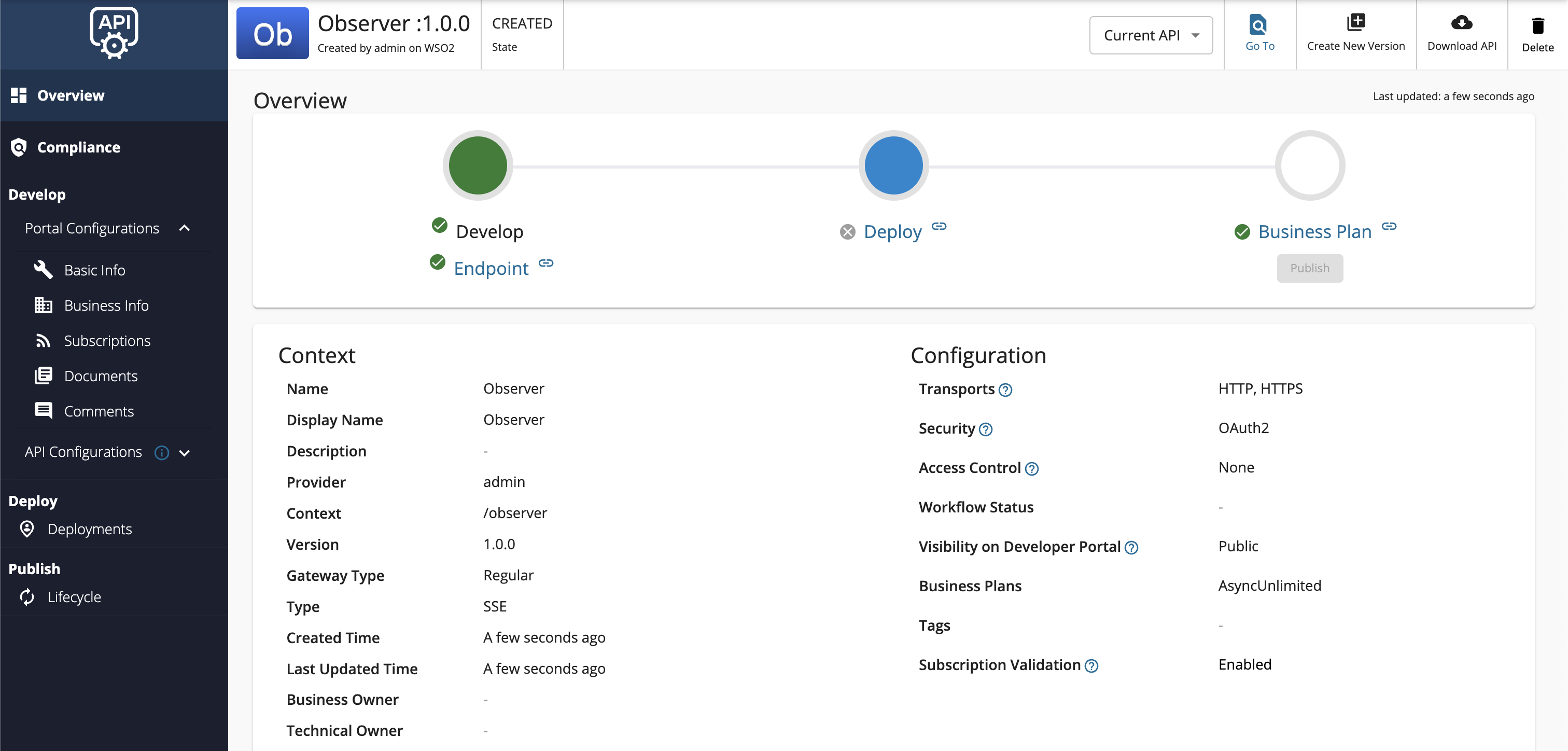 Click Lifecycle to navigate to the API lifecycle page.
