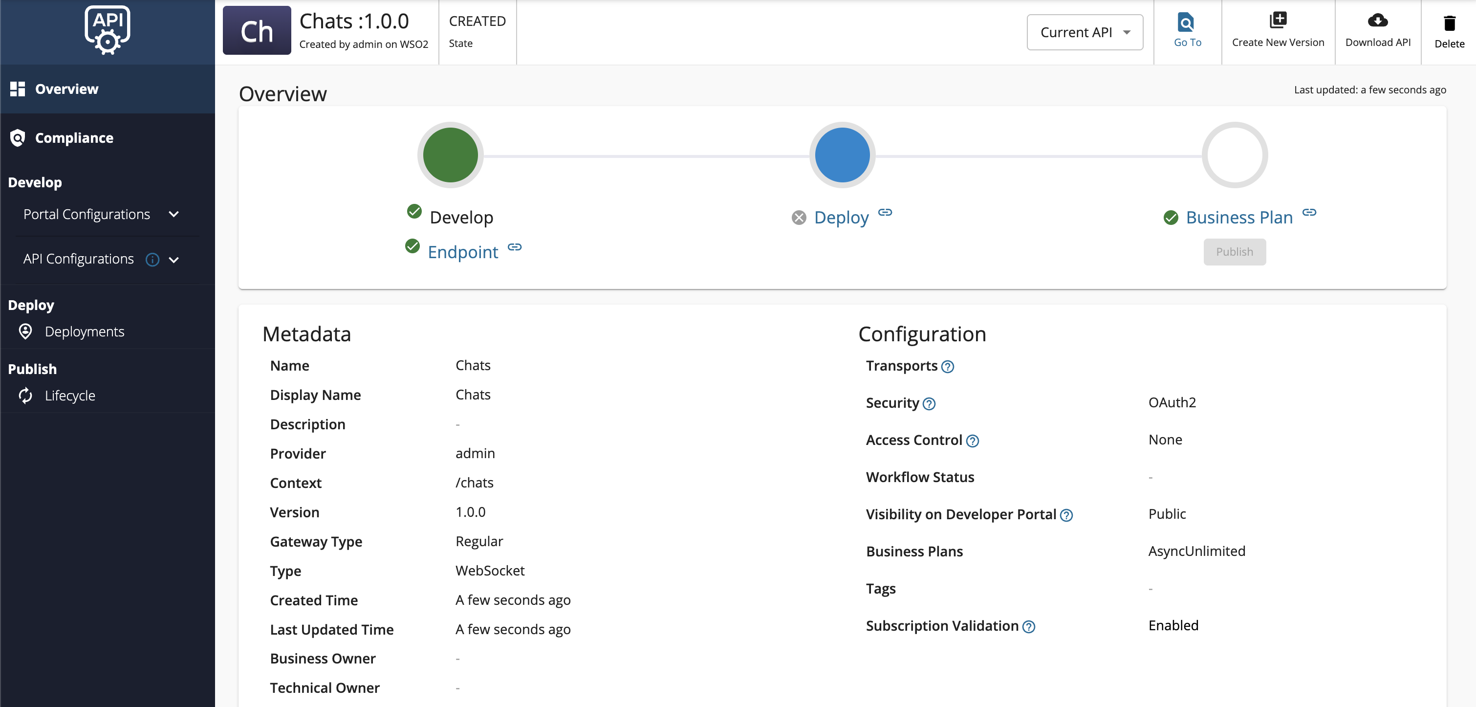Click Lifecycle to navigate to the API lifecycle, and click Publish to publish the API to the API Developer Portal.